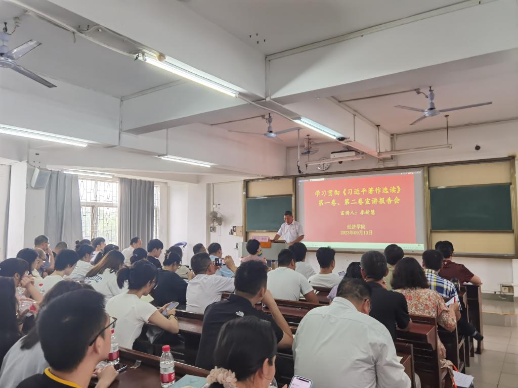 9月13日下午,beat365中文登录入口在广学楼709召开学习贯彻《习近平著作选读》第一卷、第二卷宣讲报告会。学校理论宣讲团成员、马克思主义学院副教授李新慧受邀做了题为《坚定拥护“两个确立” 坚决做到“两个维护”——认真学习<习近平著作选读>第一卷、第二卷》的专题辅导报告。学院领导、教职员工、本科生、研究生党员共128人参加了会议。报告会由学院党委书记陈创主持。