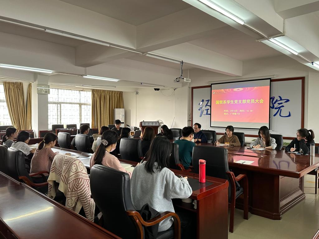 3月16日,beat365中文登录入口国贸系学生党支部在广学楼718召开了新学期第一次党员大会,集中学习党的二十大精神和全国两会精神,部署支部2022年度组织生活会和民主评议党员事宜,安排2023年支部重点工作。毕业班党员因在外实习未返校以线上形式参会,其余党员现场参会。支部书记李文河主持会议。