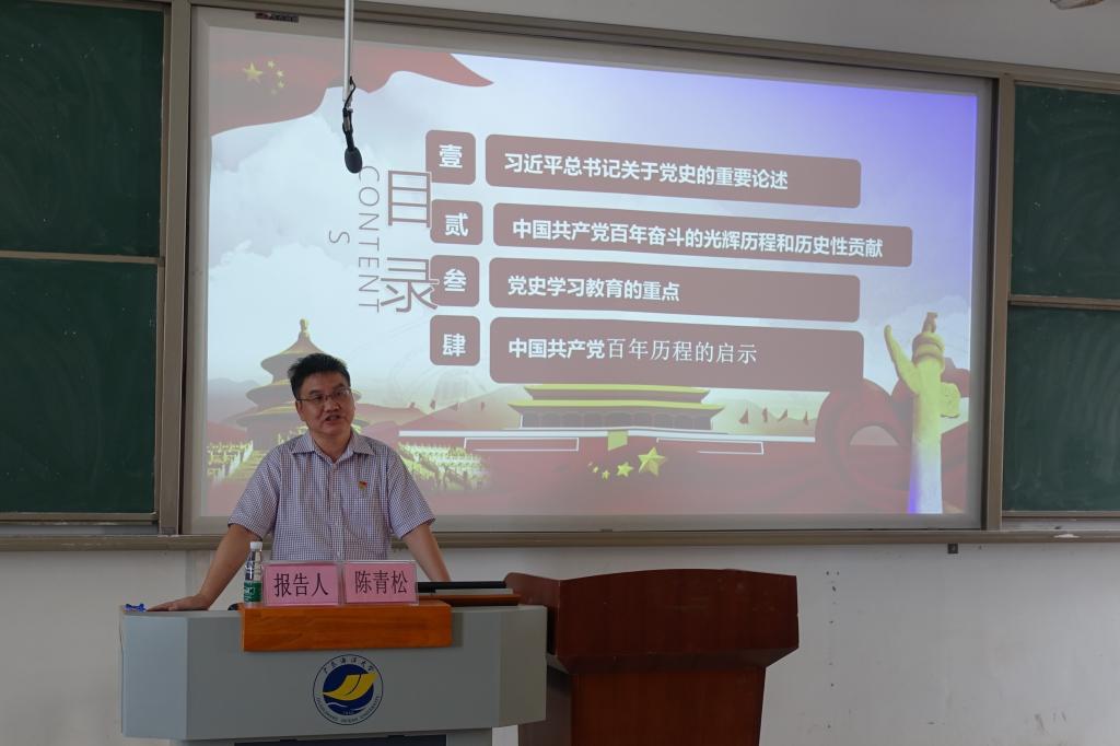 在报告会上,陈青松以“党的百年光辉历程与辉煌成就”为题,从深入学习领会习近平总书记关于党史的重要论述入手,介绍了总书记近年来关于党的历史有关重要论述、党史学习教育重大意义及目标要求,回顾了中国共产党百年奋斗的光辉历程和历史性贡献,结合时代背景分析了要深刻把握党史学习教育的重点内容,阐释了中国共产党百年历程的启示。他表示,学习党史就是要总结历史经验,以史为镜,从党史中汲取前进的智慧和力量。他寄语广大青年学子要坚定理想信念,深化对“初心”和“使命”的认识,矢志践行党的初心和使命。