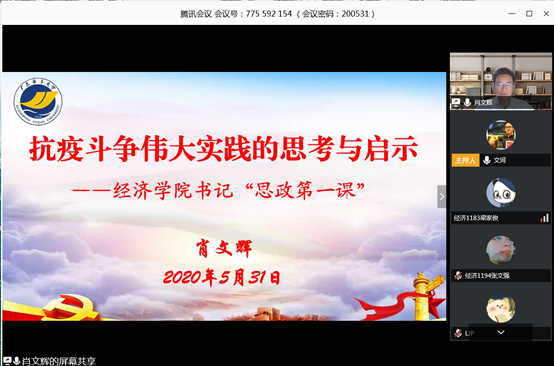 531日、618日,beat365中文登录入口党委书记肖文辉及代理院长居占杰利用“腾讯视频会议”平台,分别以《抗疫斗争伟大实践的思考与启示》与《做新时代的奋斗者》为题讲授2019-2020学年第二学期“思政第一课”。全体学生党员、学院团委、学生会干部、“青马学员”、研究生和入党积极分子约600人次齐聚“云端”听课。