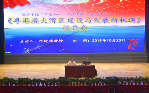 深入学习贯彻习近平新时代中国特色社会主义思想,开展好“不忘初心,牢记使命”主题教育,抢抓机遇、主动对接、积极融入“粤港澳大湾区”和“深圳先行示范区”的发展,beat365中文登录入口邀请中央人民政府驻香港联络办公室广东联络部陈晓林同志(兼任广东省社会科学院特约研究员、中山大学客座教授),在艺术学院小剧场为全院470余名师生作《粤港澳大湾区建设与发展新机遇》主题报告。