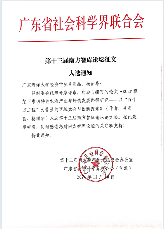 2004年12月9日,以“进一步全面深化改革与推进中国式现代化”为主题的第十三届南方智库论坛在广东省中山市成功举办。此次论坛汇聚了来自全国各地近200名专家学者,他们结合广东实际,为深化改革献计献策。《第十三届南方智库论坛论文集》作为该学术盛事的重要成果展示,收录了众多高质量研究成果,其中包括beat365中文登录入口beat365中文登录入口吕晶晶、杨丽华两位老师的论文 “RCEP框架下粤西特色农渔产业与圩镇发展路径研究——以“百千万工程”为背景的区域竞合与创新探索”。