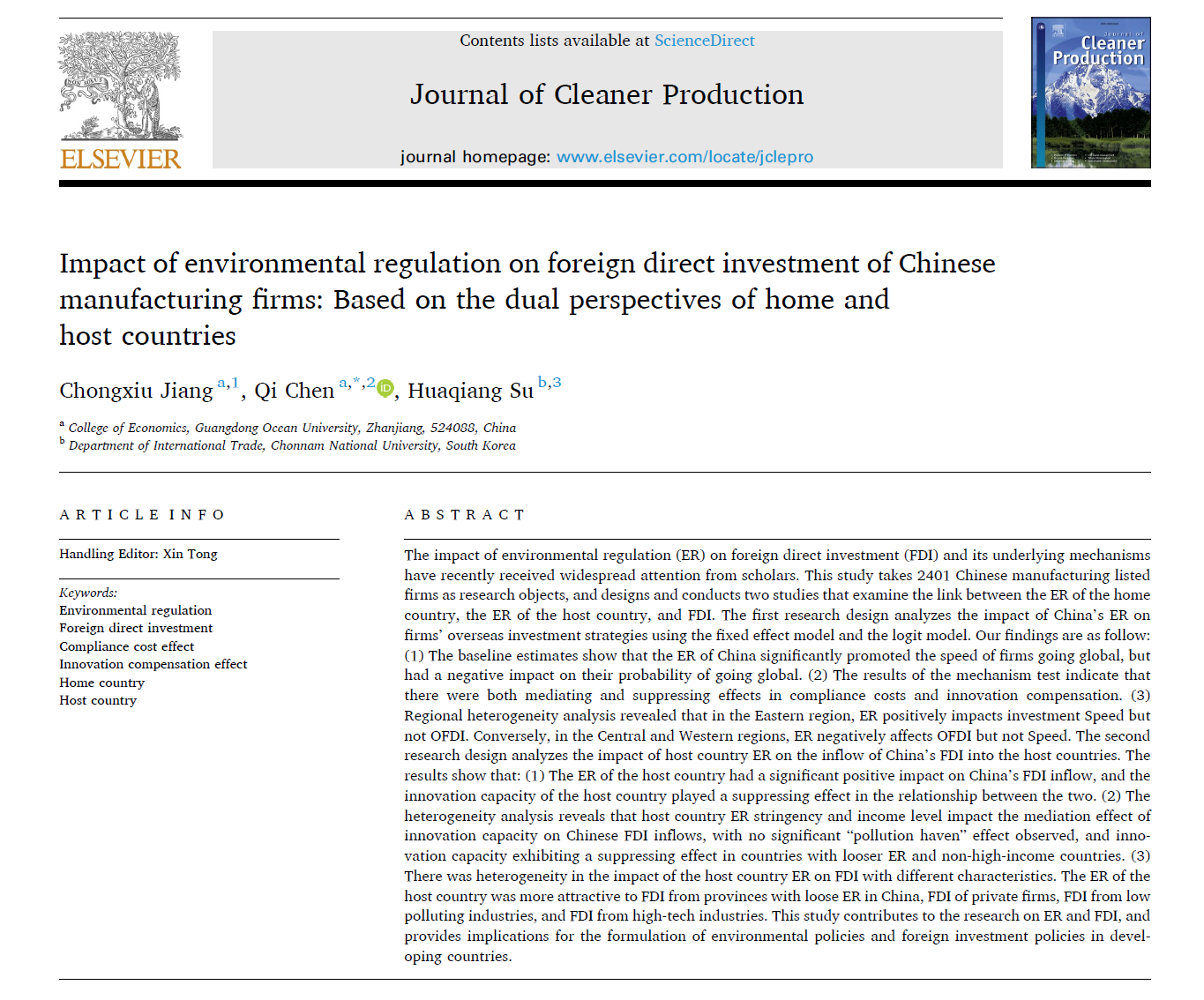beat365中文登录入口beat365中文登录入口蒋重秀副教授作为第一作者,陈琦老师担任通讯作者,在国际环境科学与生态学领域顶级期刊《Journal of Cleaner Production》(简称JCP)发表题为《Impact of environmental regulation on foreign direct investment of Chinese manufacturing firms: Based on the dual perspectives of home and host countries》的重要研究成果。该期刊2023-2024年最新影响因子为9.8,五年影响因子10.2,位列JCR环境科学与生态学Q1区,同时入选中国科学院分区(2023升级版)一区TOP期刊。这是我院在环境经济与跨国投资交叉研究领域的重要突破。