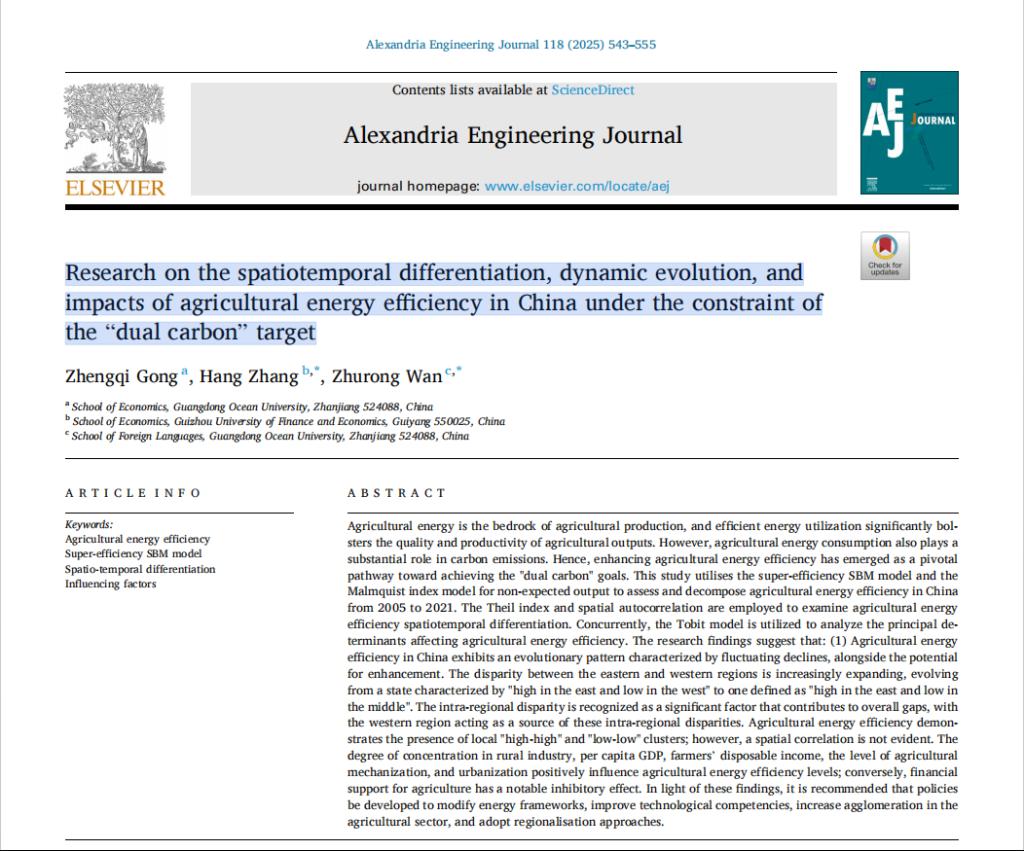 近日,beat365中文登录入口beat365中文登录入口龚征旗教授作为第一作者在国际知名期刊《Alexandria Engineering Journal》(简称AEJ)发表题为《Research on the spatiotemporal differentiation, dynamic evolution, and impacts of agricultural energy efficiency in China under the constraint of the “dual carbon” target》的高水平学术论文。该期刊2023-2024年最新影响因子为6.2,位列工程与综合类JCR Q1区,同时入选中国科学院分区(2023升级版)TOP期刊。