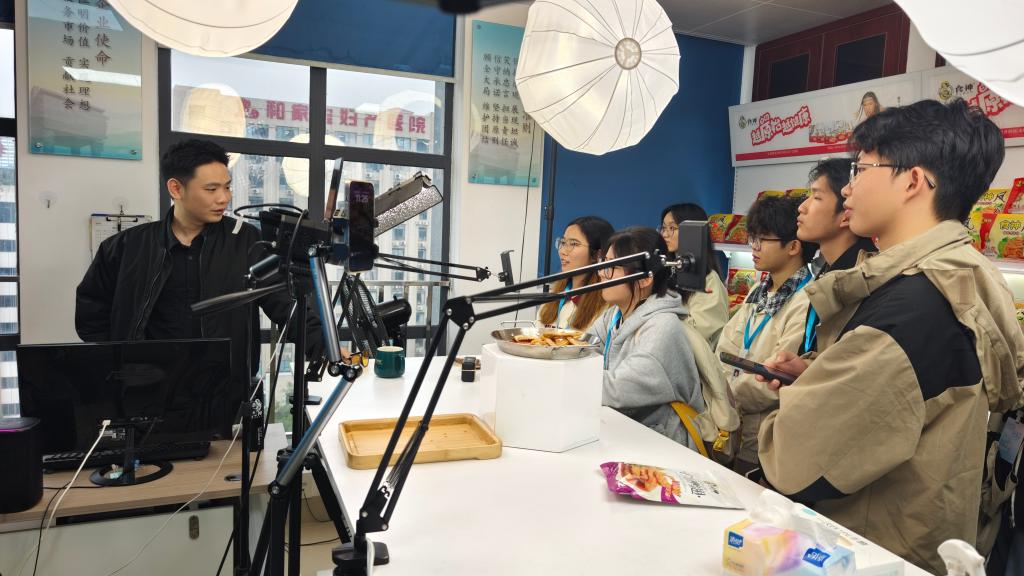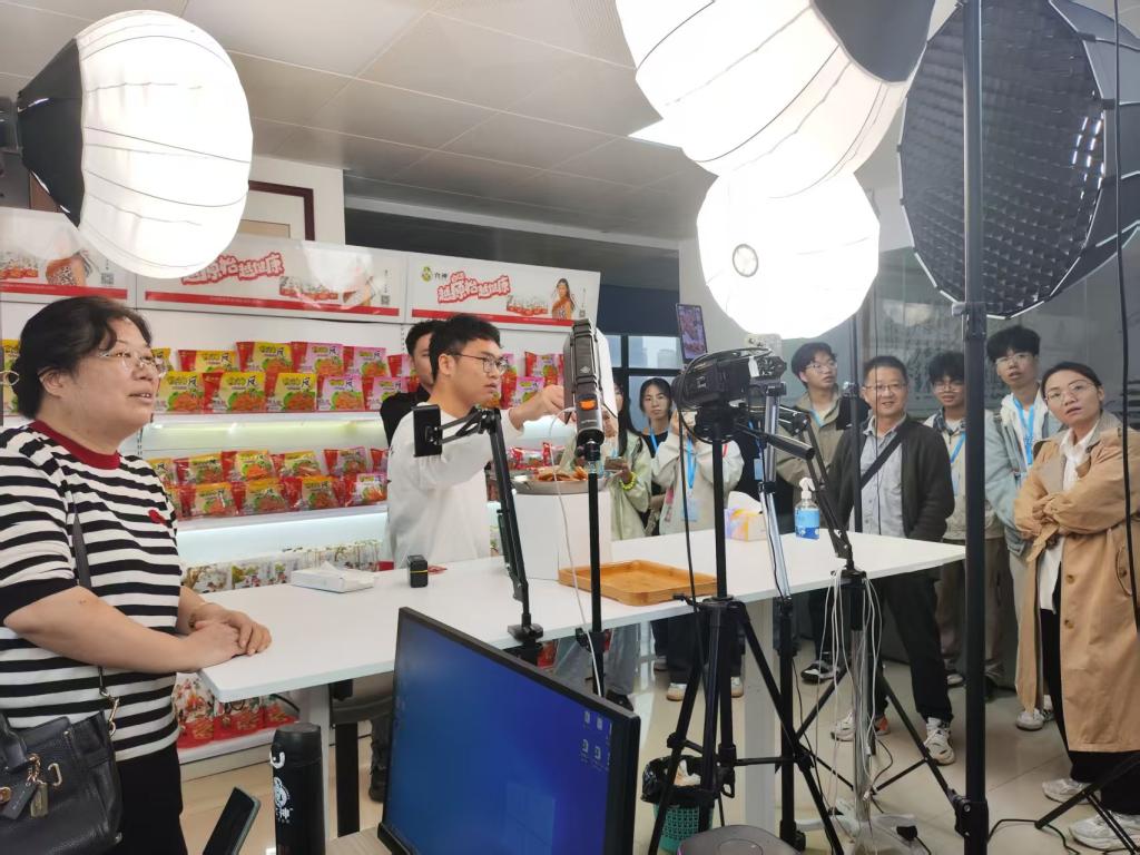 在电商大厅,师生们深度调研了直播电商全流程运营体系。从主播互动技巧到数据监测分析,从产品展示策略到流量转化机制,“食神”品牌营销负责人王经理现场拆解行业最新动态,为同学们上了一趟精彩的实践课。现场设置的“主播体验岗”让同学们直呼过瘾,多名学生代表通过实训,初步了解了直播话术设计、产品卖点提炼等实用技能,这一真实场景教学有效弥补了传统课堂的实操短板。