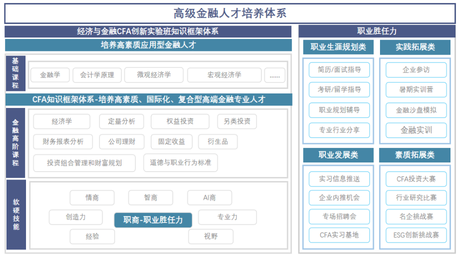 为响应国家教育强国目标和国家人才战略部署,为适应社会经济建设与发展,为顺应新时代金融人才发展要求,为培养新时代高素质、国际化、应用型金融人才,结合特许金融分析师(Chartered Financial Analyst,CFA)国际执业资格认证先进且前沿的课程体系,beat365中文登录入口经济学院于2025年特开设经济与金融专业CFA创新实验班。
