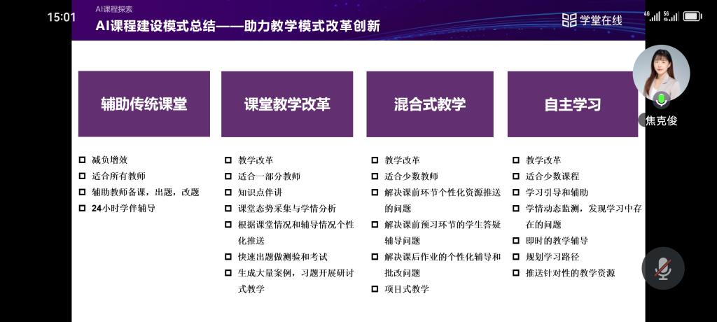 焦克俊详细讲解了人工智能赋能课程建设的相关内容,包括建设意义、建设方法、优秀案例展示、相关方案及实操等,内容丰富,为学院课程建设与教学改革提供了思路和指导。