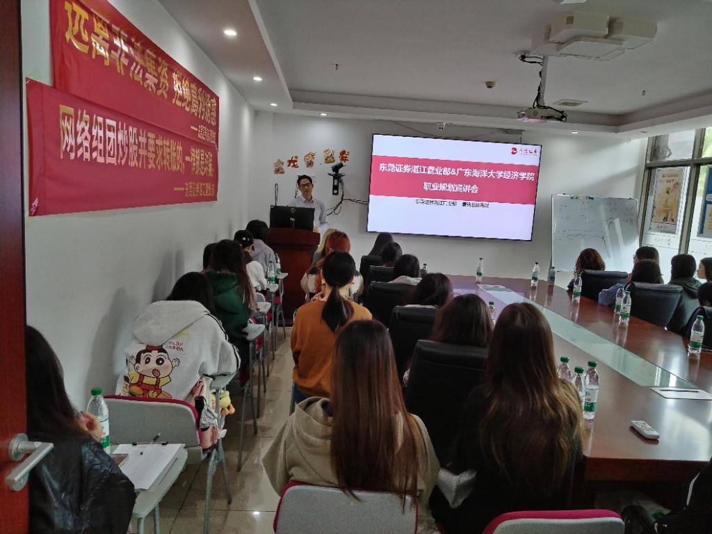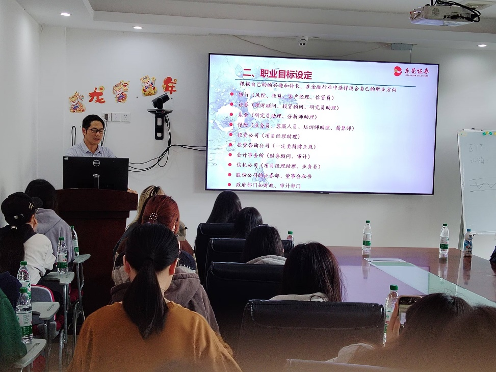活动由等多位资深金融人士主讲。活动包括专题讲座、座谈会和营业部参观等部分。在专题讲座中,东莞证券湛江营业部副总经理郑强、区域总监袁小君分享了金融行业的职业发展路径。他们结合自己的职业经历和行业趋势,为学生深入剖析了从业者在不同阶段可能面临的机遇和挑战。他们还特别提到,当前中国金融市场的数字化转型为年轻人提供了广阔的发展平台,希望同学们能够注重理论与实践相结合,做好职业规划。