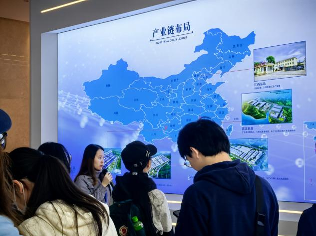 在广州—湛江市产业转移合作园,讲解员向师生们介绍了产业园的发展史以及园区结构和未来发展计划。园区融合六大功能园区,重点发展新能源与储能、新材料、电子信息三大主导产业,同时培育装备及零部件制造、海洋生物医药、食品产品加工三大特色产业,具备发展先进制造业的显著优势。