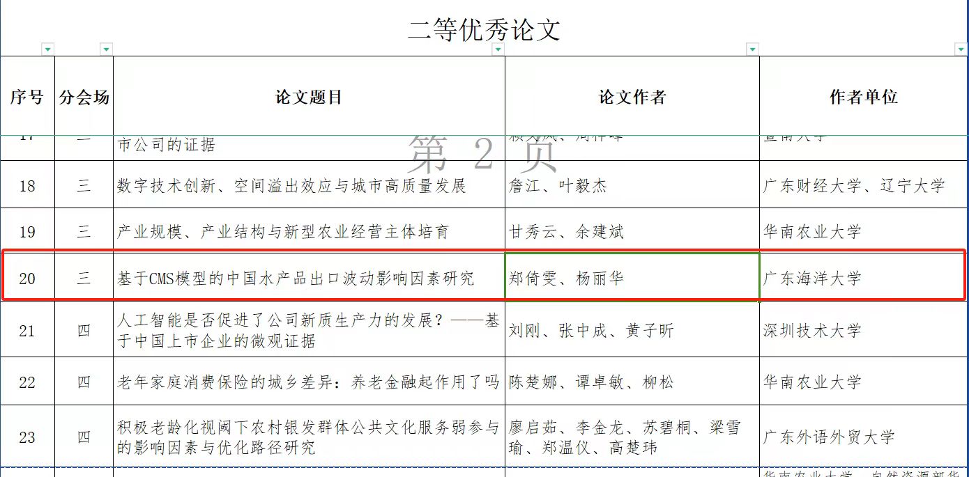 2024 年11月29日,广东省社会科学界联合会于广东人文社科网正式公布2024年广东社会科学学术年会优秀论文名单。其中,beat365中文登录入口研究生郑倚雯与导师杨丽华教授合作完成的学术论文《基于 CMS 模型的中国水产品出口波动影响因素研究》荣获优秀论文二等奖。该论文以大食物观视角切入,针对中国水产品出口波动的影响因素展开深入的实证分析。研究成果表明,出口竞争力效应是造成中国水产品出口波动的关键因素,基于此研究结论,论文提出了具有针对性的对策建议。