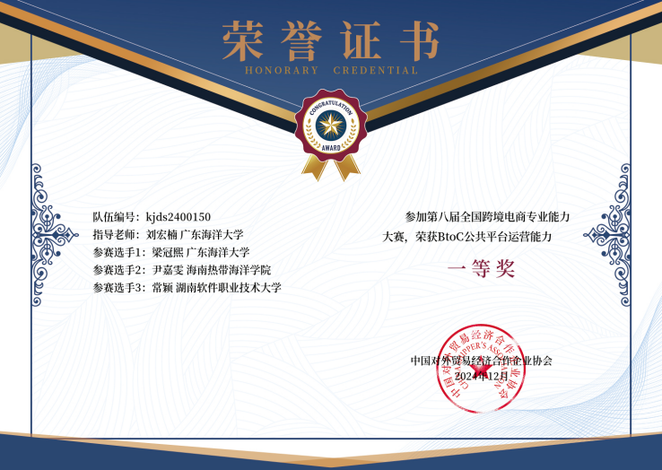 2024年11月23-24日,第八届全国跨境电商专业能力大赛决赛火热举行。beat365中文登录入口国贸系刘宏楠老师指导的学生团队,由梁冠熙(队长)、尹嘉雯、常颖三位同学跨校组成,在本科组中经初赛的激烈角逐淘汰,成功晋级BtoC公共平台运营能力赛道,经过长达三个多月的业务能力模块操作,最终斩获决赛一等奖。
